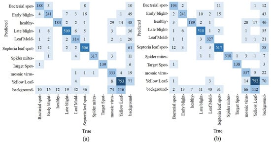 Confusion matrix for tomato leaf disease categories. (a) Confusion matrix for raw label-matching strategies; (b) confusion matrix for the improved label-matching strategy.