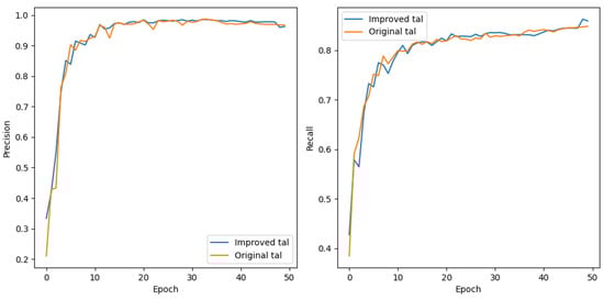 With the introduction of Inner_MPDIoU, the bounding box regression was accelerated and the loss was reduced, resulting in a reduction in the difference between the target box and the real box and the improved localization of the target. The YOLOv8n-based TaskAlignedAssigner label-matching strategy confidence and recall loss are shown in Figure 11.