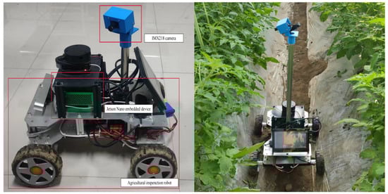 Compared with other embedded edge devices, the NVIDIA Jetson Nano has a small size, low power consumption, and good real-time performance, making it very suitable for scenarios that require mobility and embedded deployment. In addition, the Jetson Nano also provides a wealth of peripheral interfaces and GPU acceleration support, which can provide powerful processing speed and computing performance. Therefore, the Jetson Nano was selected as the main controller, and the tomato leaf disease detection platform is shown in Figure 13. The detection experiment was conducted in a greenhouse. It consisted of an agricultural inspection robot and a tomato leaf disease detection system. During the inspection process of the agricultural inspection robot, the tomato leaf detection system provided pathological information of the leaves through real-time detection of leaf images collected by the camera to complete the identification task. In addition, location information of detected tomato leaf diseases was retained for subsequent use.