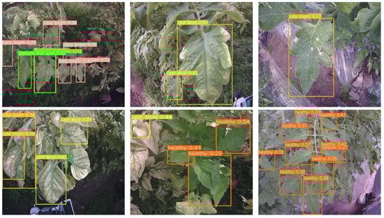 The improved YOLOv8n was validated by using tomato leaves collected in the field as a test set, and the recognition results are shown in Figure 14. The results show that the model had good detection results in a realistic environment with a complex background and lush leaves and can well meet the needs of practical applications.