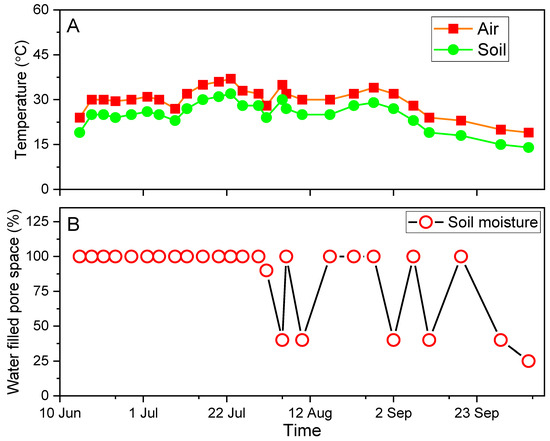 The maximal observed discrepancy between air and soil temperatures reached 5 °C (Figure 1A). The average temperatures recorded were 24.9 °C for the soil and 29.8 °C for the atmosphere. Both soil and air temperatures peaked in July and hit their lowest points in September. Initially, the soil within the pots was maintained under constant flooding conditions to a depth of 3–4 cm. Starting from the 1st of August, irrigation was halted until the soil moisture content diminished to a level representing 40% water-filled pore space, which occurred on the 6th of August (Figure 1B). Irrigation was resumed on the 6th of August but ceased again after three days. This cycle of flooding and drying, with each phase lasting 3–4 days, was consistently implemented up until the final 15 days preceding the crop’s harvest.