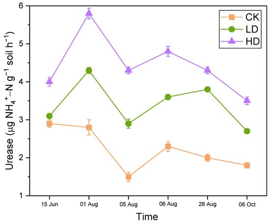 Fluctuation in urease (µg NH4+ g−1 soil h−1) following dolomite application in rice paddy soil across different rice cultivation stages. CK: control (without dolomite application), LD: low dosage of dolomitic lime, HD: high dosage of dolomitic lime. The vertical bars denote the standard errors of the mean of 3 replicates.