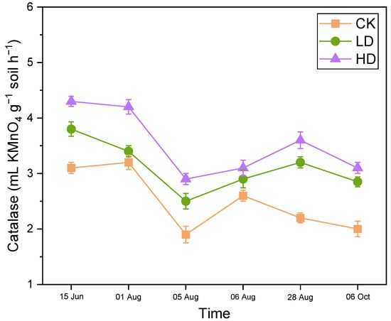 Fluctuation in catalase following dolomite application in rice paddy soil across different rice cultivation stages. CK: control (without dolomite application), LD: low dosage of dolomitic lime, HD: high dosage of dolomitic lime. The vertical bars denote the standard errors of the mean of 3 replicates.