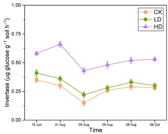 Fluctuation in invertase following dolomite application in rice paddy soil across different rice cultivation stages. CK: control (without dolomite application), LD: low dosage of dolomitic lime, HD: high dosage of dolomitic lime. The vertical bars denote the standard errors of the mean of 3 replicates.