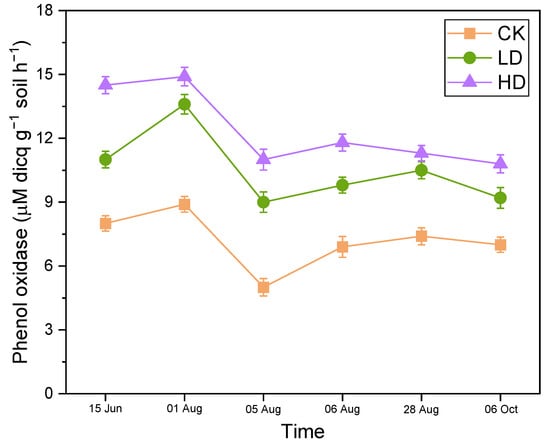 Soils treated with dolomite exhibited elevated activities for all the enzymes we tested, which included urease, invertase, catalase, phosphatase, and phenol oxidase, compared to the untreated controls. The high-dose (HD) dolomite application was particularly effective in enhancing enzyme activities, as depicted in Figure 2, Figure 3, Figure 4, Figure 5 and Figure 6. Initially, the activities of these enzymes were modest, but most experienced a significant increase by the 1st of August, which was just before the mid-season drainage, followed by a steady decline. Phosphatase activity, however, peaked post-drainage during the flooded-dry cycle phase of the experiment. The peak activities recorded for urease, catalase, invertase, phenol oxidase, and phosphatase were 5.8 µg NH4+ g−1 soil h−1 (on 1st August), 4.3 mL KMnO4 g−1 soil h−1 (on 15th June), 0.67 µg glucose g−1 soil h−1 (on 1st August), 14.9 µM 2,3-dihydroindole-5,6-quinone-2-carboxylate (dicq) g−1 soil h−1 (on 1st August), and 4.1 µg phenol g−1 soil h−1 (on 28th August), respectively, all observed in the HD treatment group (Figure 2, Figure 3, Figure 4, Figure 5 and Figure 6).