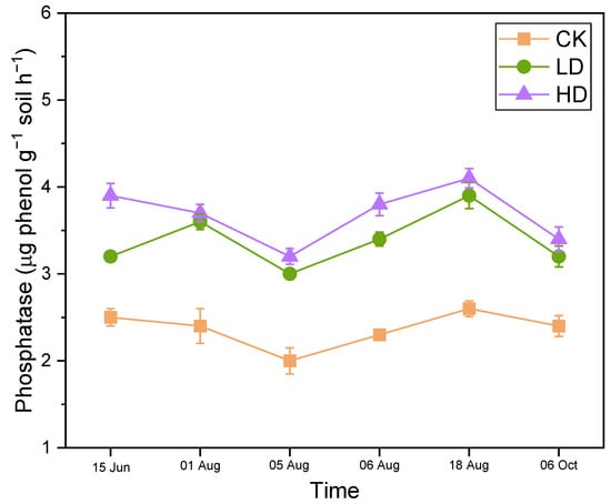 Fluctuation in phosphatase following dolomite application in rice paddy soil across different rice cultivation stages. CK: control (without dolomite application), LD: low dosage of dolomitic lime, HD: high dosage of dolomitic lime. The vertical bars denote the standard errors of the mean of 3 replicates.