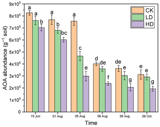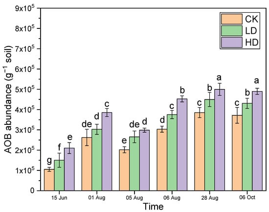 Changes in AOB gene abundance (copy numbers) following dolomite application in rice paddy soil across different rice cultivation stages. CK: control (without dolomite application), LD: low dosage of dolomitic lime, HD: high dosage of dolomitic lime. The vertical bars denote the standard errors of the mean of 3 replicates. Different letters indicate significant differences at p ≤ 0.001.