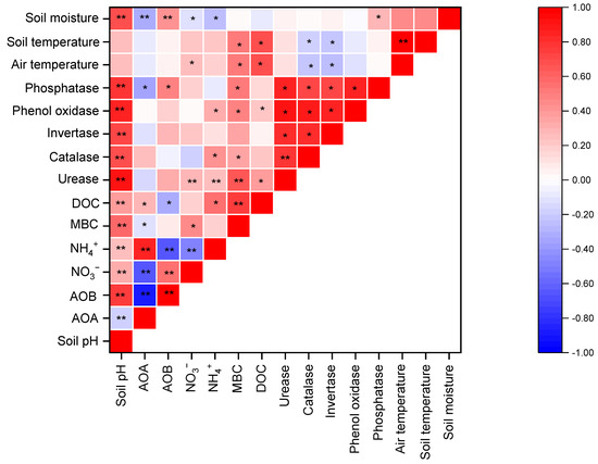 To elucidate the interconnections among various soil attributes, Pearson correlations were conducted, and the results are illustrated in Figure 9. Soil pH was negatively correlated with the abundance of AOA genes. In contrast, soil pH exhibited a pronounced positive correlation with AOB gene abundance, microbial biomass carbon (MBC), dissolved organic carbon (DOC), and nitrate nitrogen (NO3−). Moreover, soil pH was also associated with soil moisture levels and the activity of all the examined enzymes. Notably, ammonium (NH4+) and nitrate (NO3−) demonstrated an inverse relationship to each other.