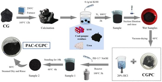 Two grams of CGPC was placed in a reaction vessel before adding 6 mL of 20% HCl at a liquid–solid ratio of 3:1. The mixture was then oven-dried at 100 °C for 3 h. Afterward, the mixture was cooled at room temperature, and then the solution pH was adjusted to 3.7 using a 0.5 mol/L NaOH solution. The mixture was oven-dried at 60 °C for 6 h and then cooled at room temperature for 10 h. The reaction mixture was subsequently placed into a glass Petri dish and oven-dried at 80 °C for 24 h to obtain the final polymeric aluminum chloride-loaded coal gangue-based porous carbon (PAC-CGPC) material (Figure 1).