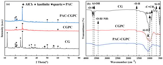 XRD spectra of CG, CGPC, and PAC-CGPC (a); infrared spectra of CG, CGPC, and PAC-CGPC (b).