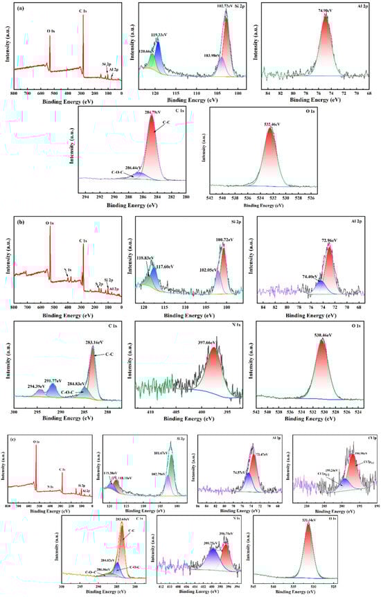 Figure 5a shows the obtained XPS spectra of the CG material. Specifically, two components were observed in the C1s region of the CG material at binding energy values of 284.79 eV (C-C) and 286.44 eV (C-O-C), whereas the O1s and Al 2p binding energies were observed at 532.46 eV (C=O) and 74.9 eV (Al2O3), respectively. The Si2p region exhibited binding energies at 102.72 (aluminosilicates) and 103.98 eV (SiO2), as well as Auger characteristic peaks at 119.33 and 120.66 eV (L2, 3M45M45) [50]. On the other hand, the C1s spectra of the CGPC material exhibited peaks at 283.16, 284.83, 291.77, and 294.39 eV (Figure 5b), corresponding to the C-C, C-O-C, C=O, and -N-C=O chemical bonds. These findings indicate the presence of abundant oxygen-containing functional groups on the surface of the CGPC material. The O1s binding energy was observed at 530.46 eV, indicating the presence of the Al-O bonds on the CGPC surface. The deconvoluted N1s spectra showed a binding energy at 397.66 eV, suggesting the presence of pyridinic N or amino groups. This result further demonstrates the contribution of urea-derived NH3 to the pore formation, which is consistent with the results shown in Figure 2. Our results showed changes in the Al 2p binding energy from 74.9 eV to 72.96 eV and 74.4 eV (Figure 5a,b). In addition, there was a change in the valence state of Al, suggesting a partial transformation of alumina to metallic aluminum.