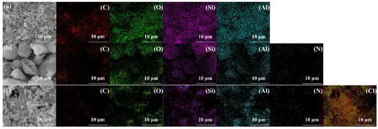 The XPS spectra of the APC-CGPC material (Figure 5c) showed C1s binding energies at 283.61, 284.82, and 286.86 eV, corresponding to the C-C, C-O-C, and C-O=C bonds, respectively. The observed peak at 531.34 eV in the O1s spectrum region indicated the presence of Al-OH, suggesting the formation of hydroxyl functional groups on the PAC-CGPC surface. The N1s binding energies were observed at 396.71 eV (metal nitrides) and 399.75 eV (silicon nitrides). In addition, two binding energies of Al were observed at 73.47 eV (aluminum silicates) and 74.57 eV (Al2O3). The Si2p binding energies were observed at 101.67 eV (Si-Al) and 102.79 eV (Si-O), forming a Si-O-Al structure [51]. Chloride (Cl) showed two binding energies at 196.90 eV (Cl 2p3/2) and 199.24 eV (Cl 2p1/2), corresponding mainly to metal chlorides. The successful loading of polymerized chlorides onto porous carbon is demonstrated. This is also shown in Figure 6.