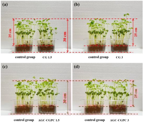 Soybean growth process (a) control group and CG 1.5; (b) control group and CG 3; (c) control group and PAC-CGPC 1.5; (d) control group and PAC-CGPC 3.