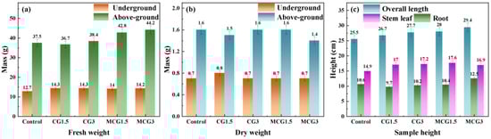 Effects of CG and PAC-CGPC on dry (a), fresh (b), and height (c) weight of aboveground and underground parts of plants.