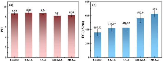 Figure 10a shows the effects of the different treatment scenarios on the soil pH values. The results revealed minimal effects of the APC-CGP and CG additions on the soil pH, indicating that the incorporation of APC-CGP did not result in the formation of alkaline conditions in the soil system. Figure 10b shows the influences of the different amendments on the soil electrical conductivity (EC). Our results showed increases in the soil EC values with increasing CG and APC-CGPC doses. Specifically, the additions of the CG material at doses of 1.5 and 3% increased the soil EC by 16.98 and 19.25%, respectively, whereas the 1.5 and 3% APC-CGPC additions increased the soil EC by 57.36 and 74.72%, respectively. Therefore, the APC-CGP addition did not lead to salinization or alkalization of the experiment soil.