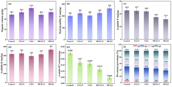 Effects of different treatments on soil organic matter content (a), hydrolyzability N (b), available P (c), available K (d), available Pb2+ content (e), and Pb2+ morphological distribution (f) after soybean planting. (S1 = water soluble fraction, S2 = carbonate-bound fraction, S3 = Fe–Mn oxides fraction, S4 = organic-bound fraction, S5 = residual fraction).