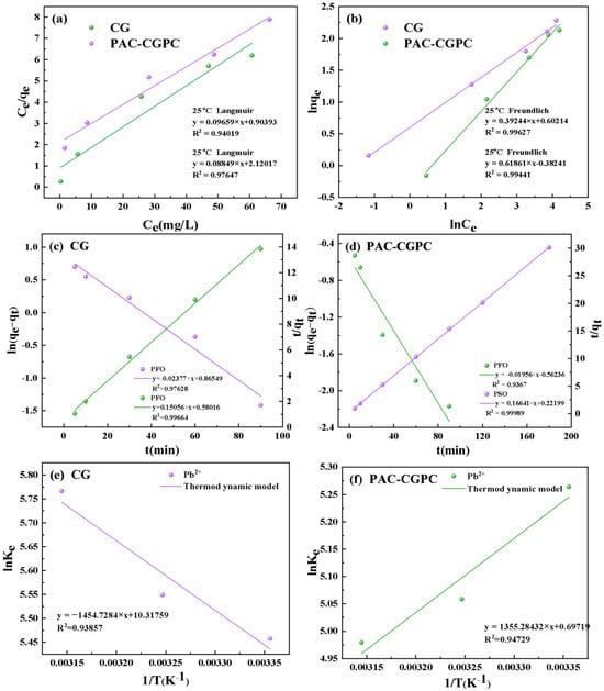 Langmuir (a) and Freundlich (b); quasi-first-order and quasi-second-order kinetic curves (c,d), the left and right y-axes correspond to PFO and PSO models, respectively. Thermodynamic curves (e,f) adsorption isothermal curves of Pb2+ adsorption by CG and PAC-CGPC.