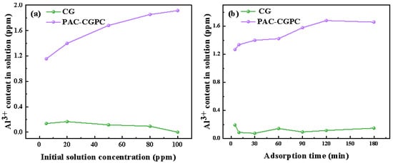 Initial solution concentration (a) and adsorption time (b) versus solution free Al3+. In (a), the adsorption time is still 2 h and the adsorbent dosage is 0.2 g. In (b), the initial concentration of lead is 100 mg/L and the adsorbent dosage is 0.2 g).