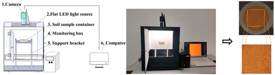 The setup for capturing photographs is crucial for the analysis of soil samples. As illustrated in Figure 2, this system primarily consists of a Hikvision MV-CE200-10UC camera (Hangzhou Hikvision Digital Technology Co., Ltd., Hangzhou, China), a flat light source, a light source driver CST-DPS24200B-4TD (Dongguan Kangshida Automation Technology Co., Ltd., Dongguan, China), a detection box, and a laptop computer. The industrial camera has a resolution of 5472 × 3648, allowing it to capture high-quality photographs with precise and high-definition details. The flat light source produces natural and uniformly dispersed illumination, enhancing the quality of the images. The light source driver allows for the modification of the light source’s brightness by utilizing the panel buttons. The sensing box is coated with a condenser substance that ensures consistent light distribution and eliminates the influence of external light.