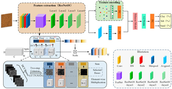 During feature extraction, deep learning employs attention techniques to guarantee that the model concentrates on the most pertinent and distinctive aspects of soil pictures while generating regression predictions. Specifically, the frequency channel attention networks (FcaNet) play a crucial role in amplifying intricate features in an image by assigning greater importance to the high-frequency elements, allowing the model to prioritize the texture details present in the image [33,34].