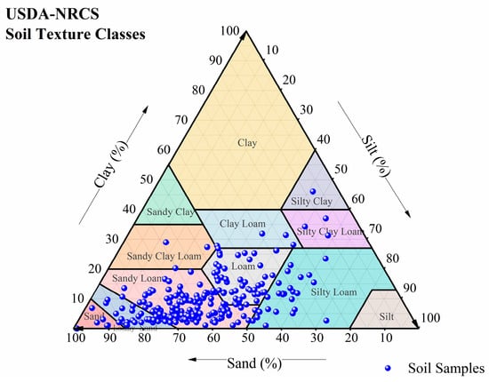 Table 1 presents the overview of descriptive statistics for the properties of the soil sample. The sand content exhibits a broad range, spanning from 7.6% to 99.1%, with an overall mean of 57.037% and a standard deviation of 17.593%. The silt percentage varies from 0.9% to 71.9%, with an average silt content of 33.034% and a standard deviation of 13.752%. The clay content fluctuates from 0% to 46.1%, with an average of 9.928% and a standard deviation of 7.713%. Most of the soil samples were collected from crop plots in Guangdong Province, where loam is the main soil type [42]. According to the USDA soil texture triangle map (Figure 4), the soil texture in this study can be categorized into four principal types: sandy soil, sandy loam, loam, and silt loam. These soil texture classifications are commonly used to describe the composition and properties of the soil, which are important for various agricultural and environmental applications.