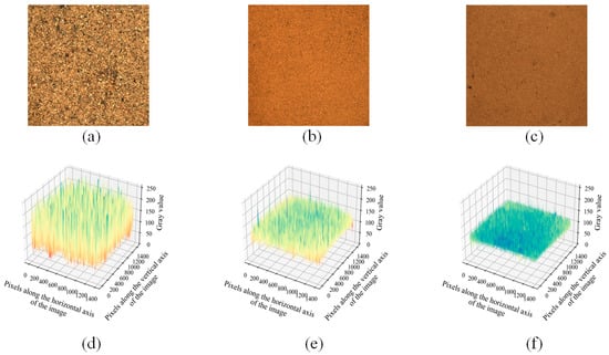Soil surface image and grayscale 3D model diagram: (a) sand surface image; (b) silt surface image; (c) clay surface image; (d) sand grayscale image 3D model diagram; (e) silt grayscale image 3D model diagram; (f) clay grayscale image 3D model diagram. Please note that (d–f) reflect the degree of change in grayscale values of three different types of soil, where the higher proportion of sand, the greater change of amplitude it suggests.
