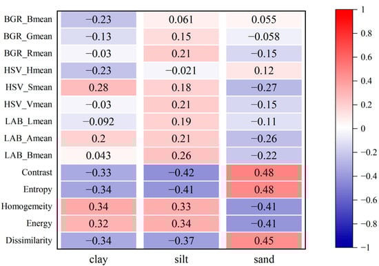 An analysis was conducted using a Pearson correlation heatmap to investigate the relationship between soil texture parameters (clay, silt, and sand percentages) and the color and texture features of the images shown in Figure 6. The results demonstrate a moderate correlation between soil texture and certain image feature variables. The correlation between RGB, HSV, and CIELab color space attributes and soil texture parameters are relatively not very strong, and their correlation coefficients are all lower than 0.3. Nevertheless, the texture information attributes derived from the gray-level co-occurrence matrix show a moderate correlation with the soil texture parameters of interest. In particular, contrast, entropy, and dissimilarity exhibit a negative correlation with clay and silt content, while they show a positive correlation with sand content. Conversely, inverse variance and energy exhibit a positive correlation with clay and silt content and a negative correlation with sand content.