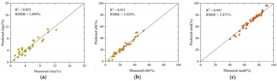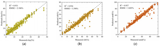 Performance of the ResNet18-FcaNet-Texture coding network on the verification set: (a) scatterplot of clay between the values measured by the hydrometer method and the values predicted by the method proposed in this study in the test set; (b) scatterplot of silt between the values measured by the hydrometer method and the values predicted by the method proposed in this study in the test set; (c) scatterplot of sand between the values measured by the hydrometer method and the values predicted by the proposed method in the test set.