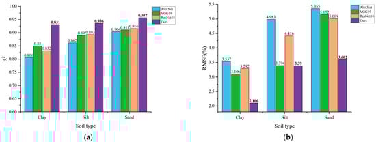 As can be seen, when soil samples from various regions are chosen to verify the generalization of the model, the value reaches 0.855 and the was 1.094% for detecting soil clay content. This accuracy is slightly lower than that achieved in the model test, possibly because of the variation in soil composition and the sensitivity of detecting fine clay particles. The detection process contains some flaws; however, the remains below the permissible range specified by the laboratory’s criteria for evaluating clay content in soil texture evaluation, which is ≤3% absolute deviation. The value for detecting loam soil content was 0.931, with an of 2.929%. For detecting sand soil content, the value was 0.947, with an of 2.871%. The test’s accuracy in loam and sandy soil is comparable to its accuracy on the test set. To summarize, the proposed network model demonstrates strong generalization capabilities for detecting soil texture, suggesting high potential in practical applications, particularly in analyzing various soil textures.