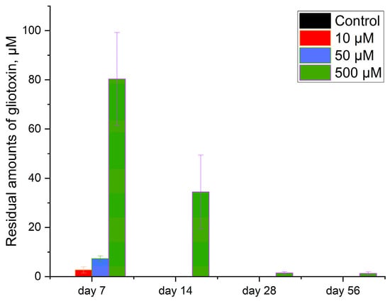In our previous study it was shown that in soils with pHH2O 7.3 and pHKCl 6.26, by the 14th day, even in samples with a high concentration (500 μM), GT is not detected []. This result is supported by another study showing that in alkaline soils with a pH of 7.4, GT was completely degraded within 5 days []. In acidic soils, it took 10 days for complete degradation []. The relationship between pH and GT stability was also shown in earlier studies examining the effect of pH on the fungistatic activity of aqueous solutions of GT [,]. In our study, in soil samples (pHH2O 6.2, pHKCl 5.6) with GT concentrations of 10 and 50 μM, GT was already not detected on the 14th day of the experiment. In samples with a concentration of 500 μM, GT was detected even on the 56th day.