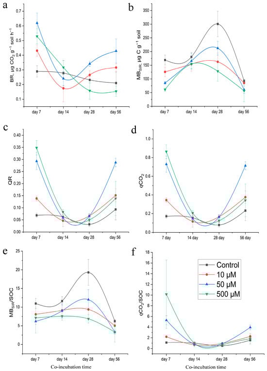The microbial biomass carbon-to-soil organic carbon ratio (MBSIR/SOC) was significantly lower in GT-treated soil compared to that in control soil (p < 0.005). On the contrary, qCO2/SOC values in the soils with GT were higher than those in the control samples (p < 0.01) (Figure 2e,f). The increase in qCO2/SOC in samples with 500 μM GT on the 14th and 56th days was not significant (p > 0.05).
