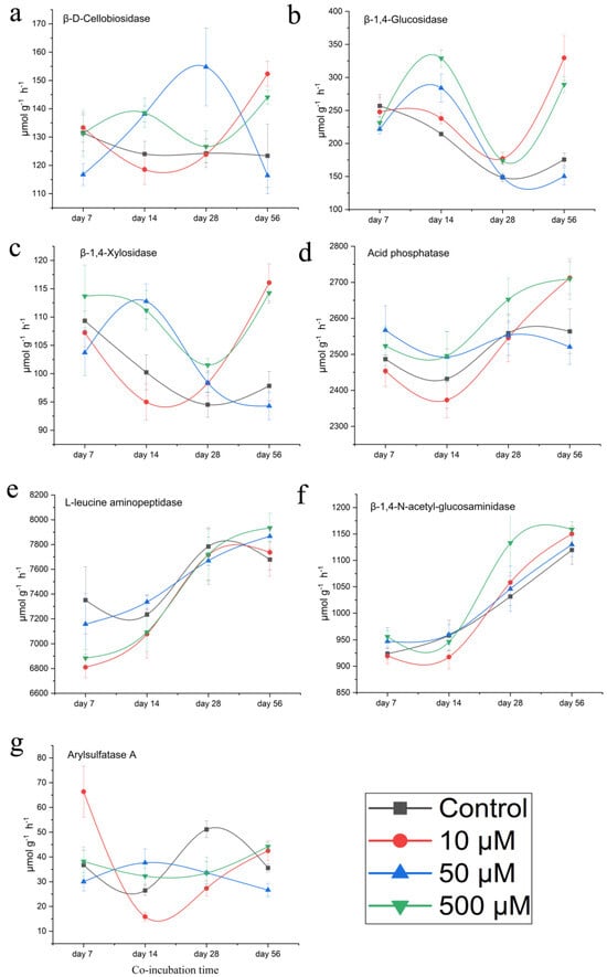 No significant changes in β-1,4-N-acetyl-glucosaminidase (NAG) activity were observed (Figure 3f). The maximum NAG activity was only observed in 500 μM GT samples on the 7th and 28th days of incubation (3.5% and 9.8% higher than the control, respectively, p < 0.001 and p < 0.05).