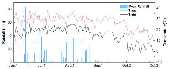 Temperature and precipitation measurements during the rice-growing season in Miyun District, Beijing, China.
