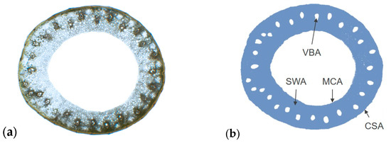 From each model, two plants were selected, and from each plant, three main stems were chosen. The middle part of the third internode at the base of the main stem was sliced using the freehand sectioning method. Observation and examination were conducted using a microscope (LEICA DVM6, Leica Microsystems GmbH, Wetzlar, Germany) at 4× magnification, and photos were taken under the lens. Subsequently, Adobe Photoshop CC 2018 was used to stitch the photos together to obtain a complete cross-section image of the internode. The large vascular bundle was marked using the lasso tool, and software Image J 2 was used to measure the vascular bundle area (VBA) and transverse section. The cross-section area (CSA) and medullary cavity area (MCA) were also measured, and the stem wall area (SWA, Figure 4) was calculated by