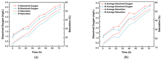 Atmospheric reoxygenation is a crucial method for oxygenating natural water bodies. A point with a water depth of 30 cm was selected to represent the reoxygenation level near the rice roots, and the average concentration represented the overall reoxygenation level in the experimental rice fields. As shown in Figure 5, under stagnant water conditions, the dissolved oxygen (DO) concentration and saturation in areas A and B at a depth of 30 cm reached 2.04 mg/L, 1.78 mg/L, 24.8%, and 21.7%, respectively, after 24 h. The DO and saturation in A are superior to those in B, with A being 14.61% and 14.29% higher than in B, respectively. The average dissolved oxygen concentration in A and B is 2.04 mg/L and 1.64 mg/L, with an average saturation of 24.9% and 20%, respectively. A is 14.61% and 14.29% higher than B, indicating a higher reoxygenation rate in A compared to B. The average dissolved oxygen and average saturation in A are 24.39% and 24.50% higher than in B, respectively, further demonstrating the superior reoxygenation rate in A.
