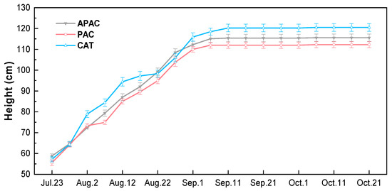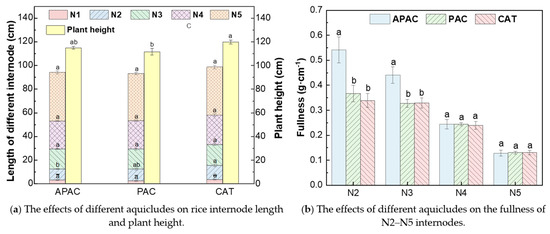 Throughout the rice growth period, the APAC has a minor impact on plant height, while the CAT significantly affects rice plant height during the tillering stage, with no noticeable impact during the rest of the growth period (Figure 10). During the rice greening stage, there is a trend of APAC > CAT > PAC in plant height, with a significant difference, indicating that the APAC can promote rapid seeding growth. In the tillering stage, plant height in CAT increased faster than in APAC and PAC. Following the jointing and grain-filling stage, overall plant height showed a trend of CAT > APAC > PAC. Plant height in APAC was about 2.97% higher than in PAC and approximately 4.07% shorter than in CAT (Figure 9). During the yellow ripening stage, there were significant differences in plant height among different aquicludes. Figure 11a also indicates that the lodging index of different aquicludes is not correlated with plant height during the yellow maturity stage.