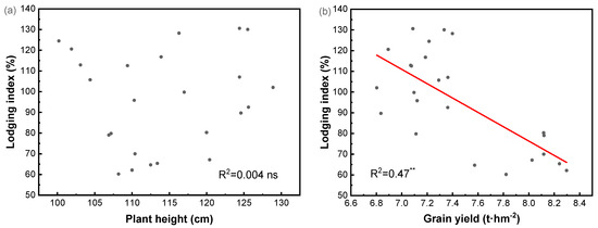 The relationship of lodging index with plant height (a) and grain yield (b). Data were pooled from research conducted by the APAC, PAC, and CAT during yellow maturity stage. ns, not significant at the 0.05 probability level; **, significant at the 0.01 probability level.