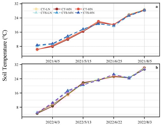 Changes in soil temperature at 0–10 cm depth during two wheat growing seasons in 2021 (a) and 2022 (b). CT–LN, conventional tillage–low nitrogen; CT–MN, conventional tillage–medium nitrogen; CT–HN, conventional tillage–high nitrogen; CTS–LN, conventional tillage with straw mulching–low nitrogen; CTS–MN, conventional tillage with straw mulching–medium nitrogen; CTS–HN, conventional tillage with straw mulching–high nitrogen. Vertical error bars represent the standard error of mean values.