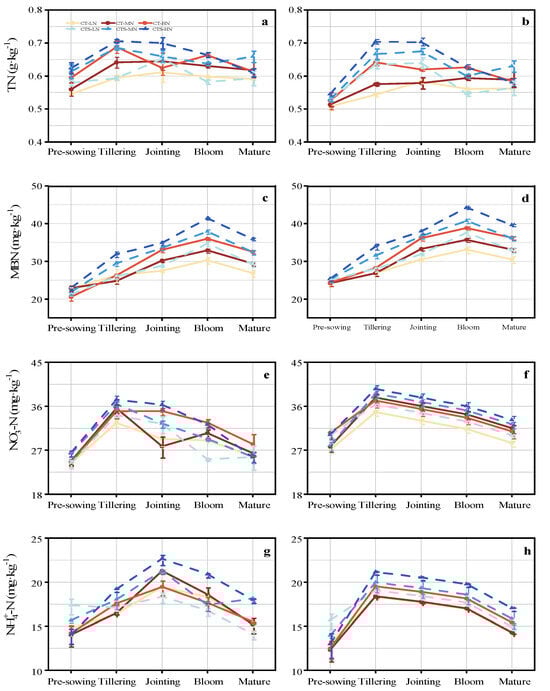 Changes in soil TN, MBN, NO3−-N, and NH4+-N at 0–10 cm depth during two wheat growing seasons in 2021 (a,c,e,g) and 2022 (b,d,f,h). CT–LN, conventional tillage–low nitrogen; CT–MN, conventional tillage–medium nitrogen; CT–HN, conventional tillage–high nitrogen; CTS–LN, conventional tillage with straw mulching–low nitrogen; CTS–MN, conventional tillage with straw mulching–medium nitrogen; CTS–HN, conventional tillage with straw mulching–high nitrogen. Vertical error bars represent the standard error of mean values.