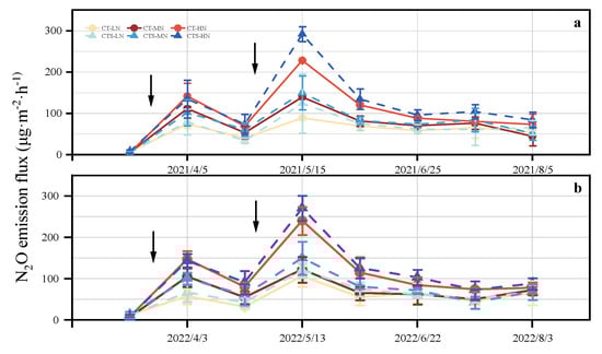 Changes in soil N2O emission flux during two wheat growing seasons in 2021 (a) and 2022 (b). CT–LN, conventional tillage–low nitrogen; CT–MN, conventional tillage–medium nitrogen; CT–HN, conventional tillage–high nitrogen; CTS–LN, conventional tillage with straw mulching–low nitrogen; CTS–MN, conventional tillage with straw mulching–medium nitrogen; CTS–HN, conventional tillage with straw mulching–high nitrogen. Vertical error bars represent the standard error of mean values. Black arrow indicates fertilization.