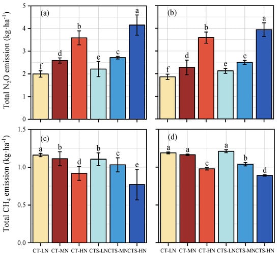 Total emissions of soil N2O and soil CH4 during the two wheat growing seasons in 2021 (a,c) and 2022 (b,d). CT–LN, conventional tillage–low nitrogen; CT–MN, conventional tillage–medium nitrogen; CT–HN, conventional tillage–high nitrogen; CTS–LN, conventional tillage with straw mulching–low nitrogen; CTS–MN, conventional tillage with straw mulching–medium nitrogen; CTS–HN, conventional tillage with straw mulching–high nitrogen. Vertical error bars represent the standard error of mean values. Different lowercase letters show significant differences between different treatments at p < 0.05.