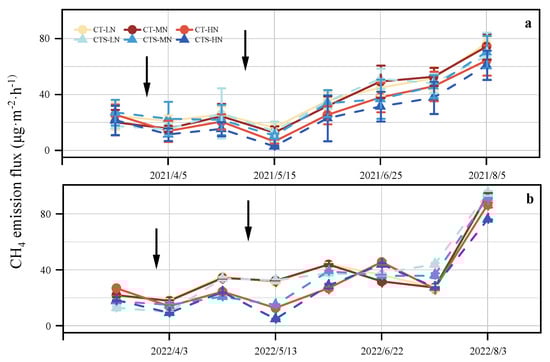 Changes in soil CH4 emission flux during two wheat growing seasons in 2021 (a) and 2022 (b). CT–LN, conventional tillage–low nitrogen; CT–MN, conventional tillage–medium nitrogen; CT–HN, conventional tillage–high nitrogen; CTS–LN, conventional tillage with straw mulching–low nitrogen; CTS–MN, conventional tillage with straw mulching–medium nitrogen; CTS–HN, conventional tillage with straw mulching–high nitrogen. Vertical error bars represent the standard error of mean values. Black arrow indicates fertilization.