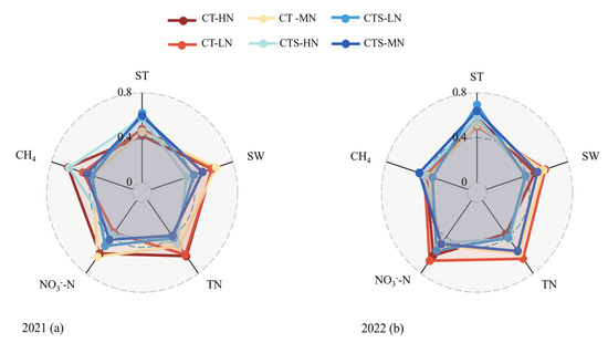 Referring to previous research results [35], the obtained soil quality was divided into three grade standards, with an equidistant interval of 0.2 for comparative analysis. It was judged that the SQI of the study area was generally at a moderate level (Table 6). Specifically, CTS improved soil quality compared with CT at different levels of nitrogen application, with CTS–MN having the highest SQI in both years. The CTS–MN treatment achieved higher soil quality scores in terms of ST and CH4 absorption rates, and also performed well in soil quality scores among other indicators (Figure 6), resulting in an overall higher SQI for CTS–MN compared with other treatments.