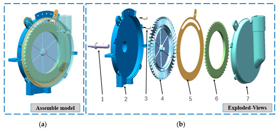 Structure diagram of seed-metering device: (a) assembled model; (b) exploded views: 1. shaft; 2. rear shell; 3. brush; 4. seed-carrying wheel; 5. adjustment baffle; 6. seed-picking wheel; 7. front shell.