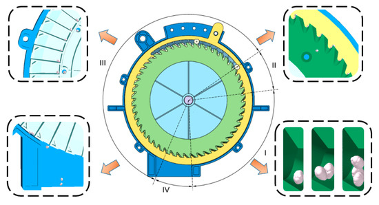 Work area division diagram of seed-metering device: I—seed picking; II—seed clearing; III—seed carrying; IV—seed dropping.