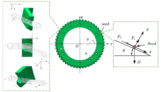 After measurement, the static friction angle between the seeds and the material of the seed-picking wheel was found to be 24.9°, and θ was determined to be 20° according to the structure of the seed discharger and the pre-test. The angle θ between the axis a and the x axis will increase with the rotation of the seed-picking wheel to meet the design requirements of the return side of the hole.