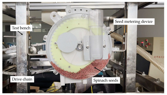 In order to verify the influence of the main structural and working parameters of the spinach seed-metering device on the seeding performance, the seed scoop with the optimal parameters was fabricated by 3D printing for bench-test verification. The material was ABS resin, and the accuracy was 0.1 mm. The test was conducted on the JPS-12 seed-metering device performance test bench in the laboratory of Nanjing Institute of Agricultural Mechanization, Ministry of Agriculture and Rural Affairs, as shown in Figure 7. The test was carried out with the rotational speed of the seed wheel set to 18 rpm, while the radius of the spoons was 2.25 mm and the number of spoons was 50. A total of 150 holes were used for each group, and three groups were tested. After the seeding performance became stable, the counting began. After the data were counted, the qualified index, reseeding index, and missing index of each group were calculated in accordance with the standard GB/T 6973-2005 [35] ‘Single Seed (Precision) Seeder Test Method’ and the actual agronomic requirements of direct precision hill seeding of spinach. The test results showed that the qualified index was 91.56%, the missing index was 1.56%, and the reseeding index was 6.89%.