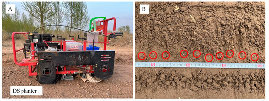 Field testing of planter: (A) photographs of field trials; (B) field trial sowing effect.
