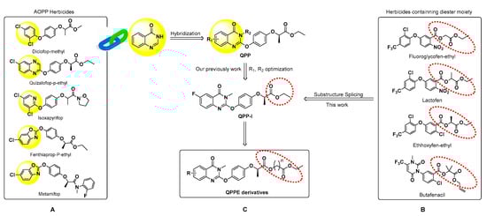 Design of target compound QPPE by substructure splicing strategy. (A) Commercial AOPP herbicides; (B) Commercial herbicides containing a diester moiety; (C) The structure of designed target compound QPPE.