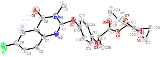 The series target compounds QPPE-I to QPPE-IV were prepared via a five-step synthetic route as depicted in Scheme 1. First, anthranilic acids 1a-1d reacted with methyl isothiocyanate in EtOH by using Et3N as a base to provide intermediates 2a-2d, which were reacted with SO2Cl2 in CHCl3 to provide intermediates 3a-3d. Then, the important intermediates 4a-4d were obtained by the nucleophilic substitution reaction between intermediates 3a-3d and (R)-2-(4-hydroxyphenoxy)propionic acid in DMF using K2CO3 as a base. Finally, intermediates 4a-4d reacted with oxalyl chloride in the presence of a catalytic amount of DMF to produce the corresponding acyl chlorides 5a-5d, which were reacted with an alcohol ester in the presence of Et3N and a catalytic amount of DMAP to afford the series target compounds QPPE-I to QPPE-IV in yields of 31.4–61.4%. The structures of all the target compounds were characterized via 1H NMR, 13C NMR, and HRMS. In addition, the structure of compound QPPE-I-7 was confirmed using X-ray diffraction analysis (CCDC 2372256; Figure 2).